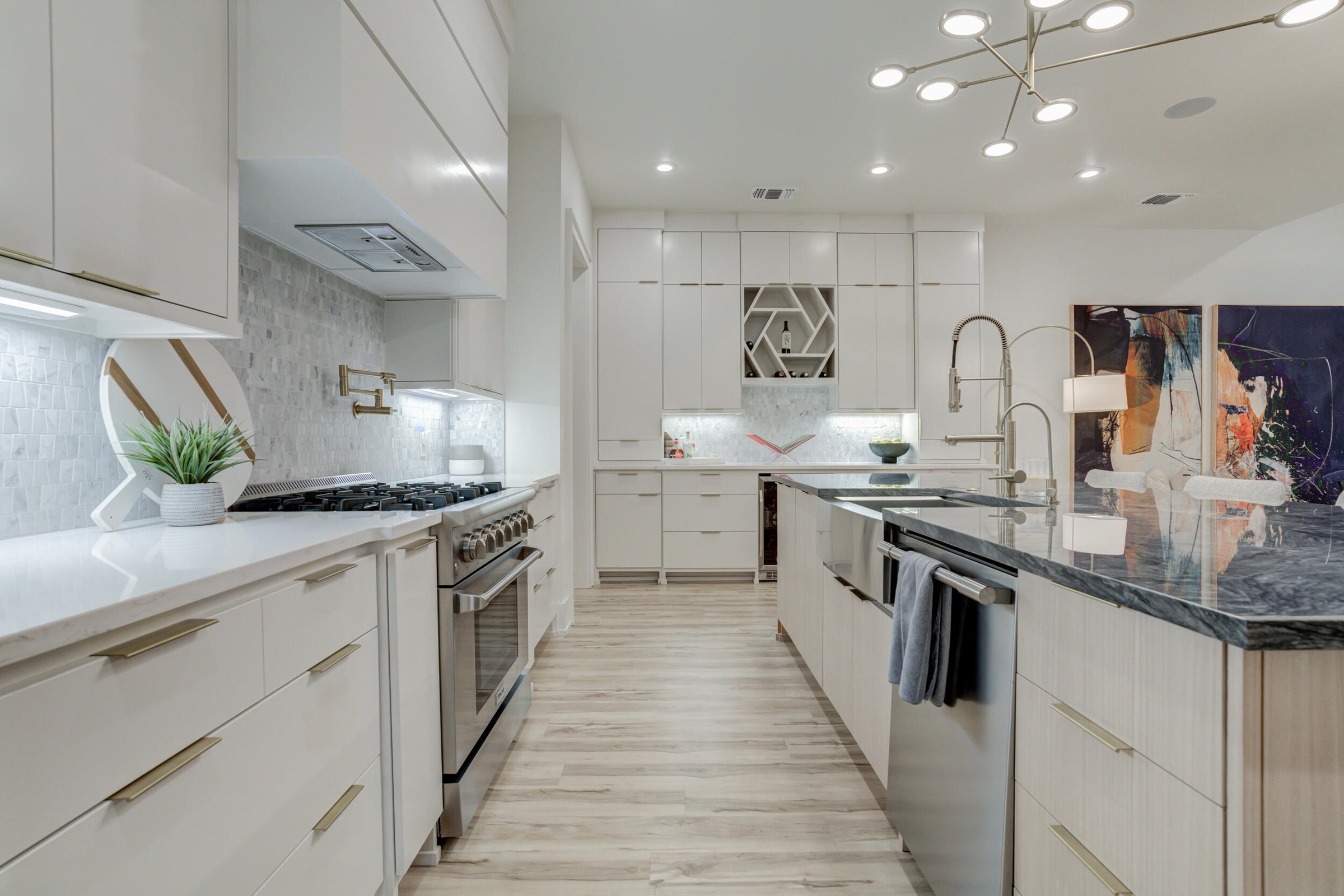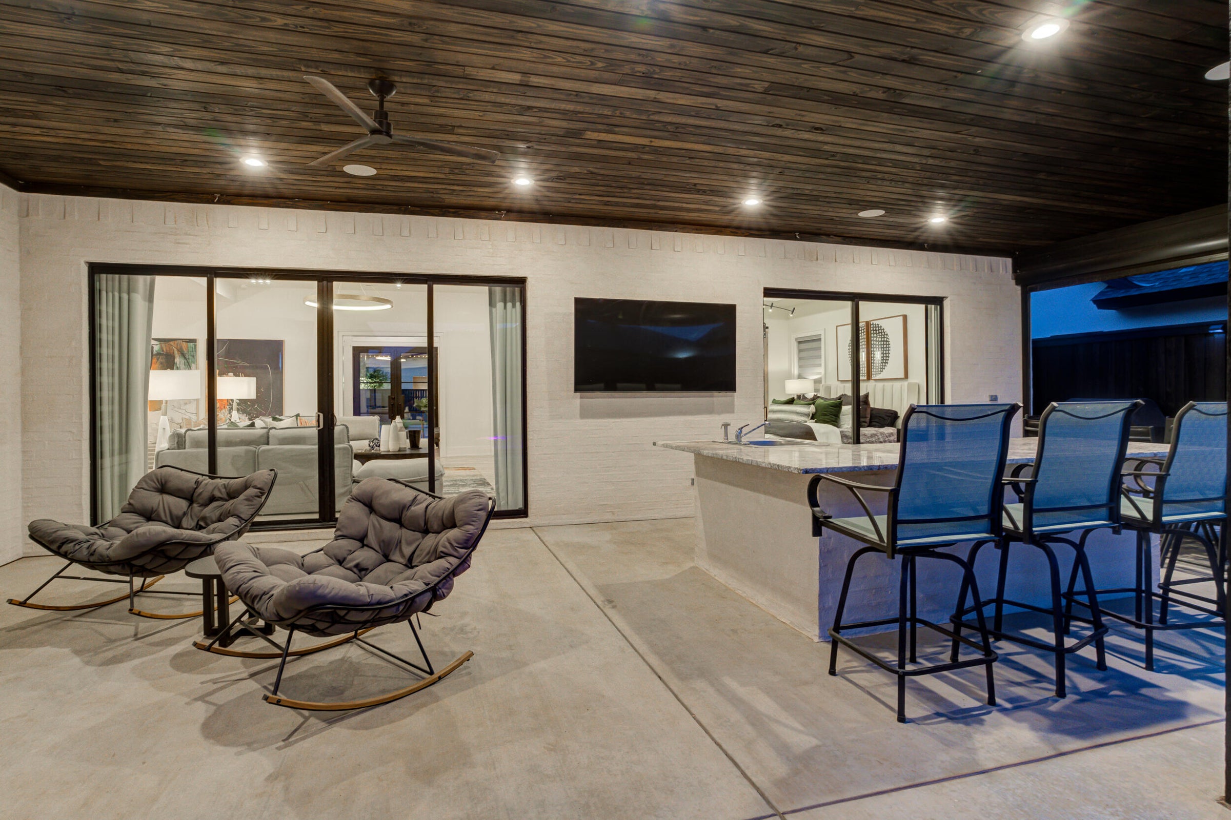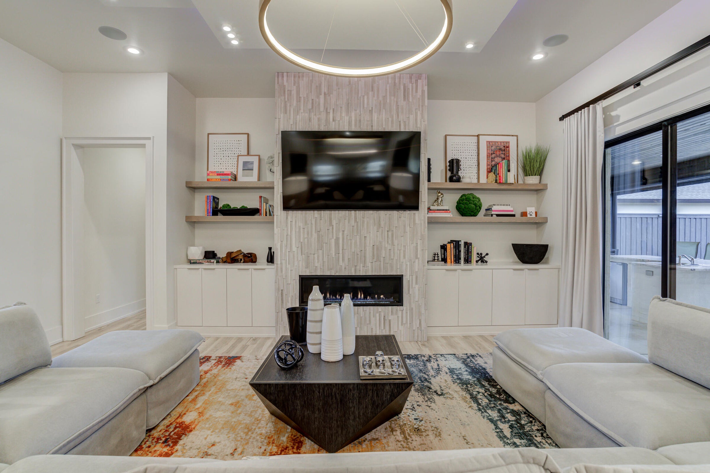 This is the home everyone has been waiting for. A rare blend of modern luxury, thoughtful design, and resort-style living—every detail of this 4-bedroom residence is crafted to impress. Step inside to an inviting open layout anchored by a striking living room fireplace and sophisticated architectural lines. The flow of the home is seamless, warm, and intentionally designed for both everyday living and elevated entertaining. The chef's kitchen is a true showpiece, featuring custom cabinetry, statement lighting, perfectly appointed island, and premium finishes throughout—perfect for hosting, entertaining, and gathering in style. Each bedroom offers its own private en-suite bath, giving everyone their own retreat. The basement is ideal for movie nights, game days, or a cozy getaway—an amenity rarely found at this level. The backyard feels like your own private resort with a luxury pool, integrated hot tub, outdoor fireplace, and a dedicated half bath for poolside convenience. The covered patio is equipped with Beat-The-Heat retractable shades, creating comfort year-round. Don't forget the three car garage with extra storage and a convenient walk-in attic! From the modern exterior to the meticulously designed interior details, this home delivers unforgettable style, comfort, and function. Opportunities like this are rare—schedule your showing now!